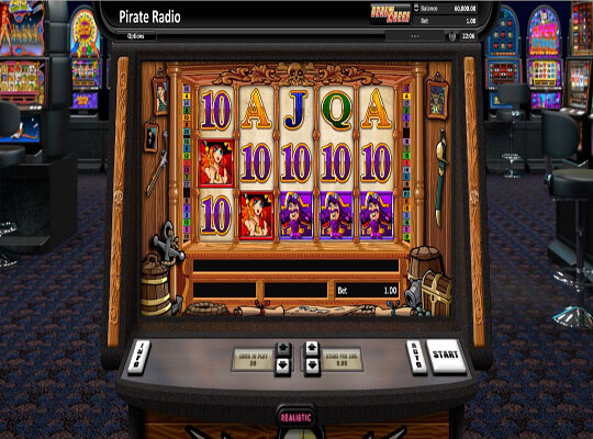 If you are a fan of pirate movies, then you will certainly enjoy this pirate themed pokie machine by Realistic Games, the game offers players the chance to join a crew of pirates as they roam the seas and the oceans looking for fortunes and treasures. That is not all, as these pirates have a good taste in music that they have their own radio channel. This is why the pirate skull symbol that the pirates are known for, has a headset on, which is the symbol of their radio channel.