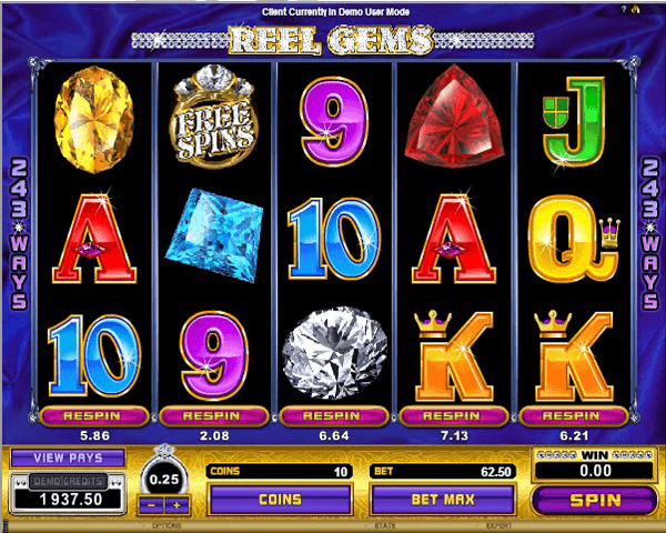 Reel Gems is a 243 payline video slot machine that is developed by Microgaming. The game has five non progressive reels and it comes with numerous bonuses and features. For example, the game has a wild symbol, a scatter symbol, free spin rounds and a multiplier. The game also has an 8,000 coins jackpot. The game has a very unique feature. This feature is called the ReSpin feature. This allows players to place a fee in order to respin one single reel of their choosing.