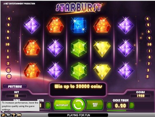 The game’s setup is presented in 5 reels and 10 lines. On these lines & reels, players will see diamonds that have different color such as red, blue, yellow and purple. Other symbols include a red seven, Bar symbol and the Starburst wild symbol. Players will find plenty of options under the reels including spinning the game, the betting options and the auto play feature. This auto play feature enables players to place a bet and specify a number of spins and the game will start spinning automatically.